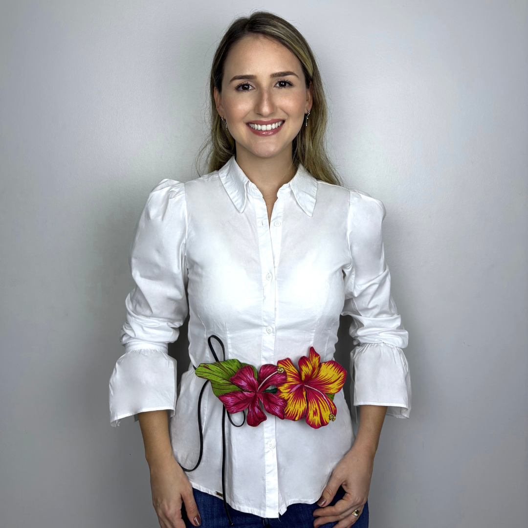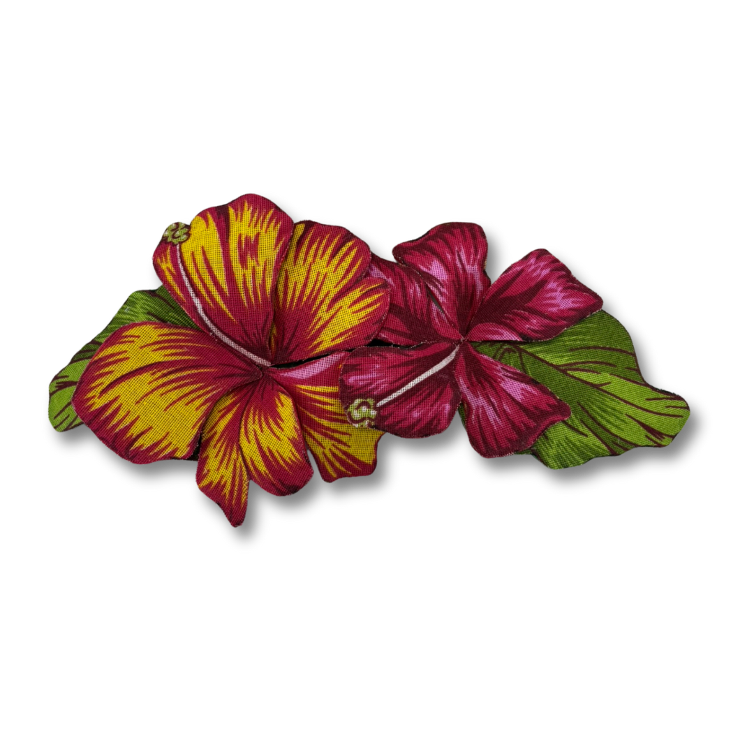Flores artesanais em tecido chita com efeito 3D. Use de várias formas: em roupas, bolsas e até na decoração. Um toque vibrante e autêntico para composições criativas e tropicais.