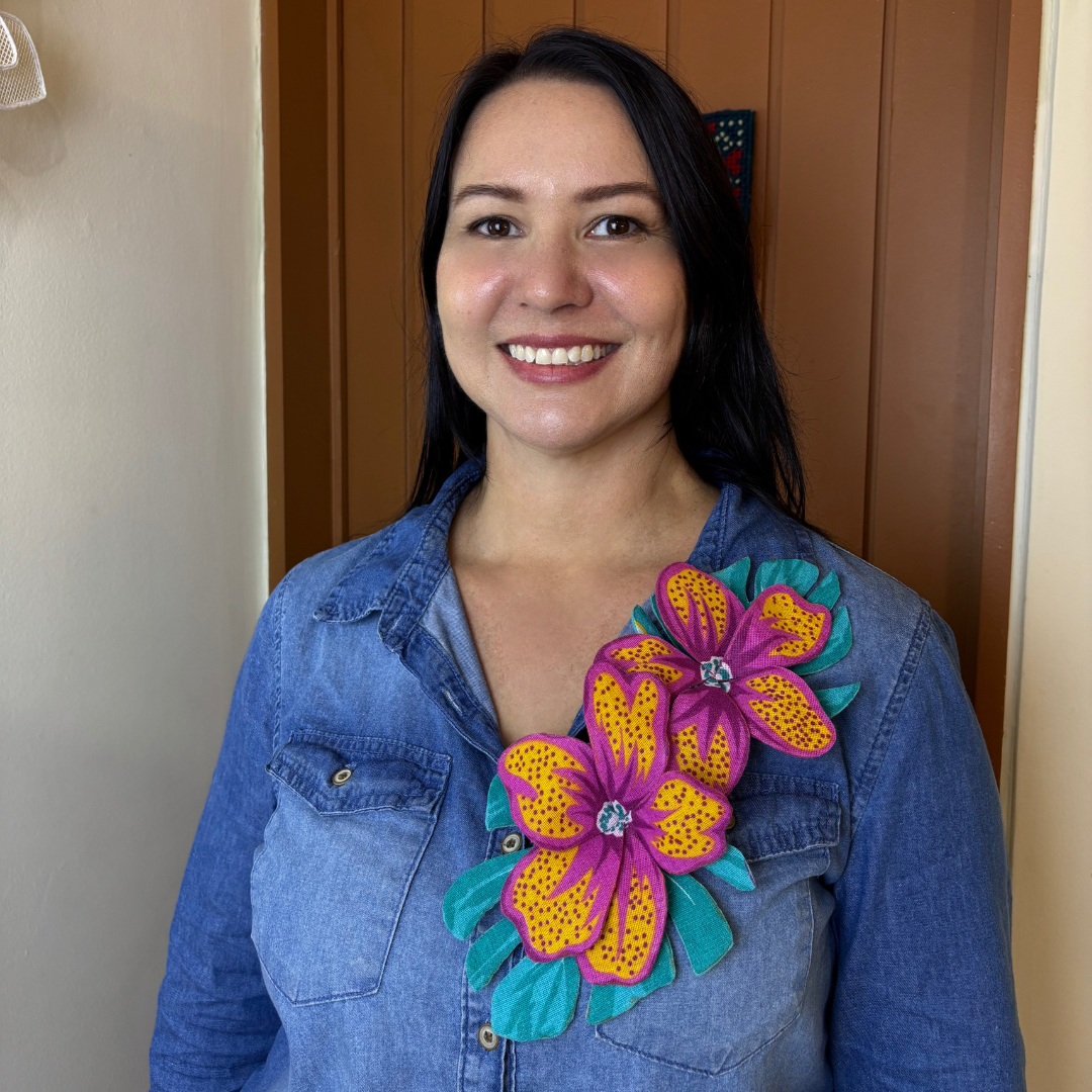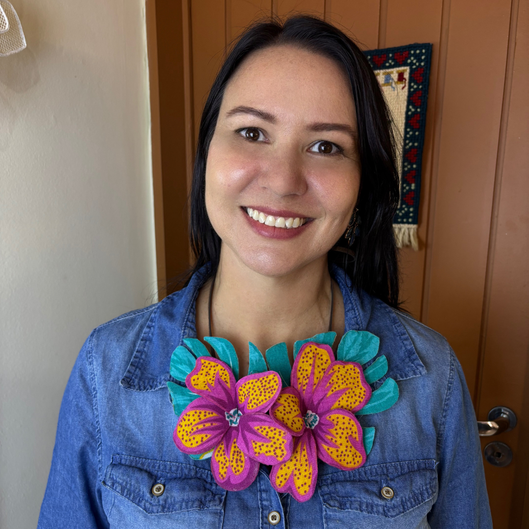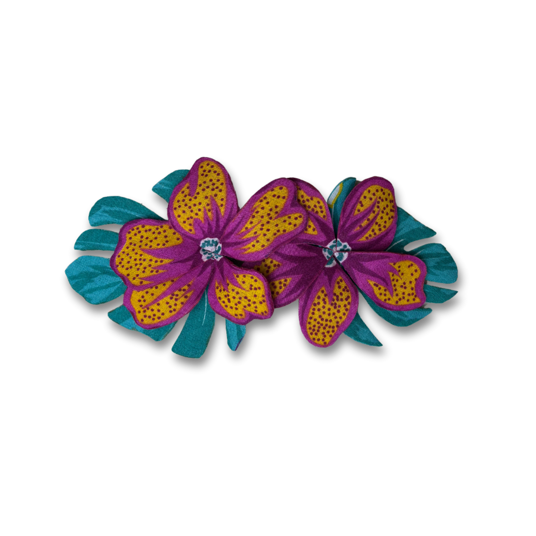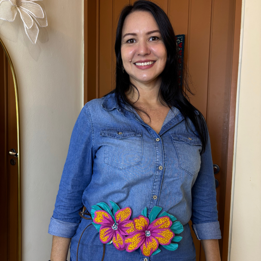 Flores artesanais em tecido chita com efeito 3D. Use de várias formas: em roupas, bolsas e até na decoração. Um toque vibrante e autêntico para composições criativas e tropicais.