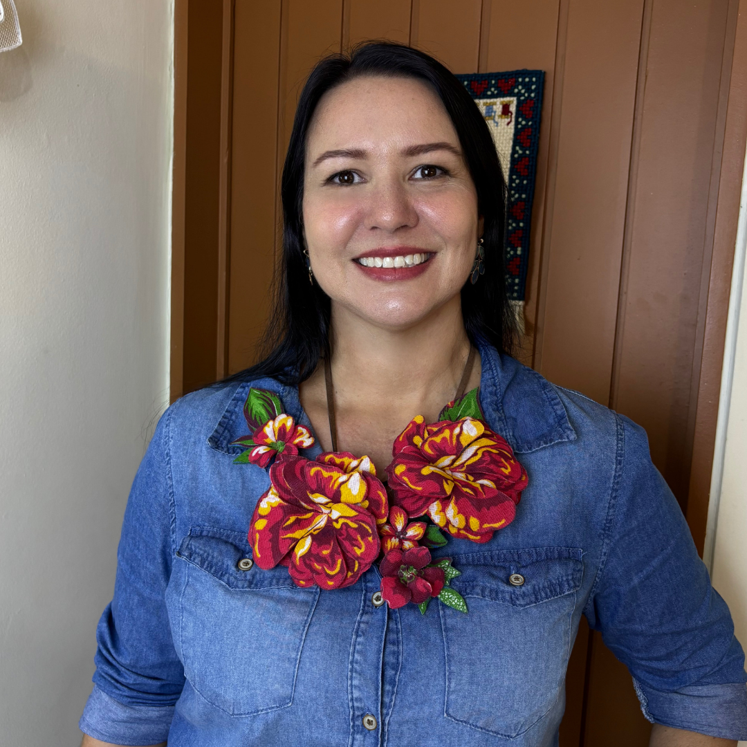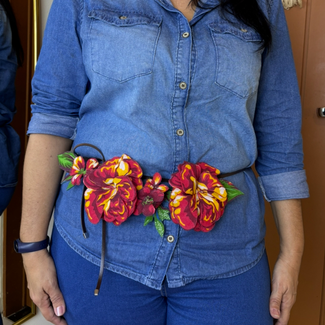 Flores artesanais em tecido chita com efeito 3D. Use de várias formas: em roupas, bolsas e até na decoração. Um toque vibrante e autêntico para composições criativas e tropicais.