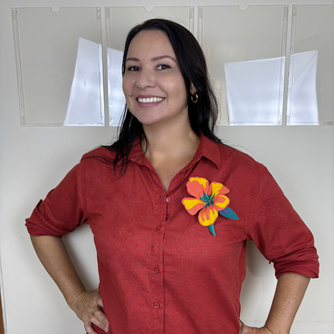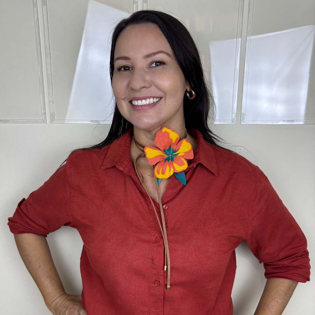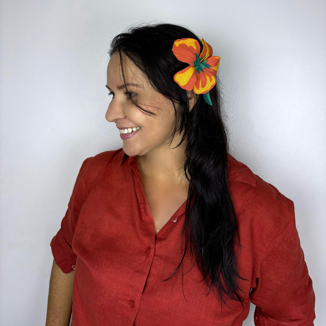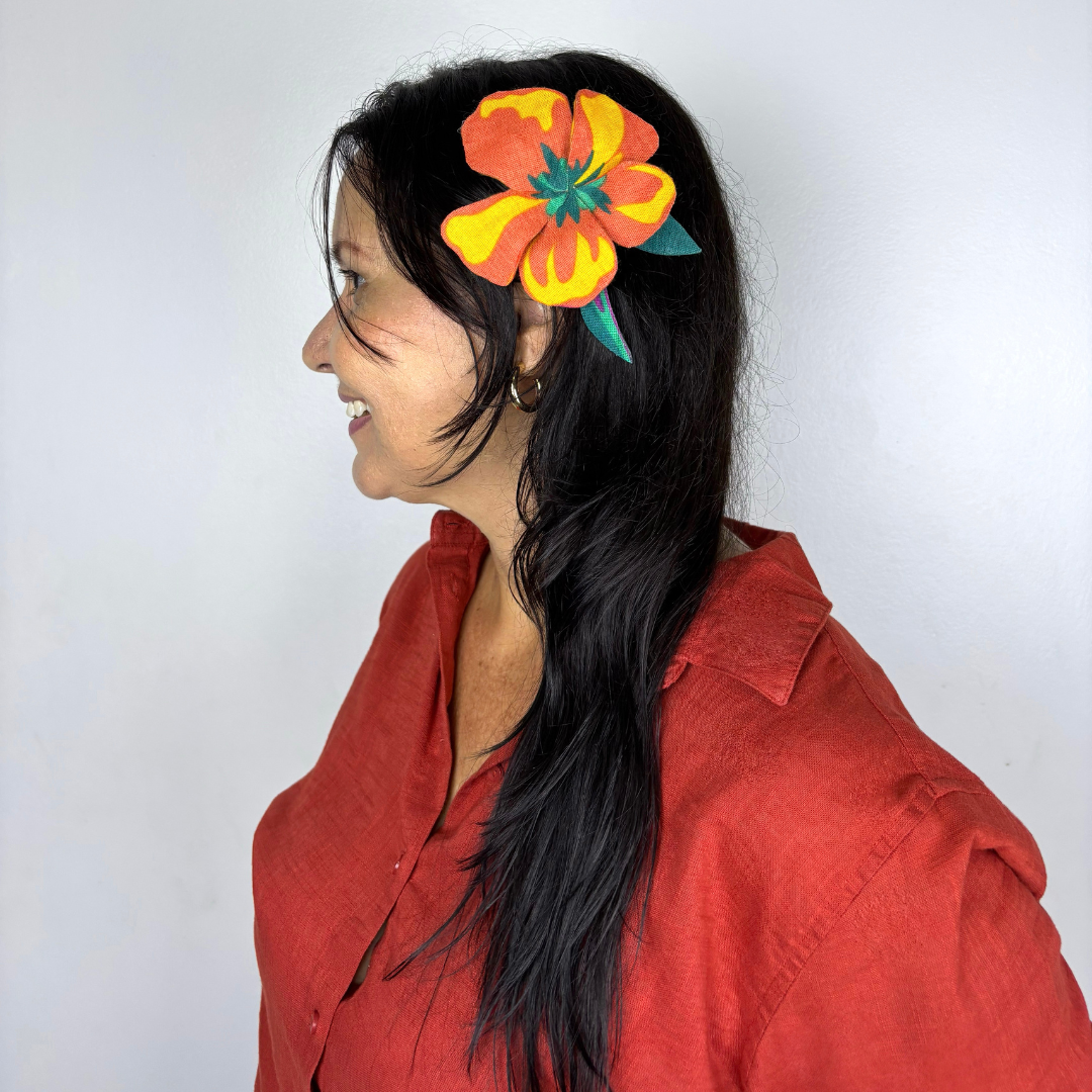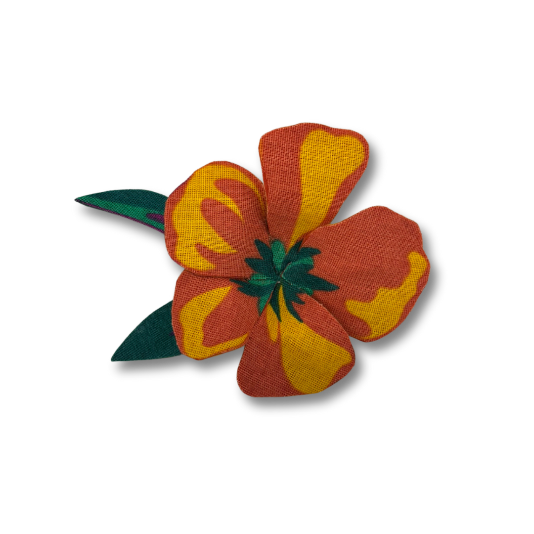 Flores artesanais em tecido chita com efeito 3D. Use de várias formas: em roupas, bolsas e até na decoração. Um toque vibrante e autêntico para composições criativas e tropicais.