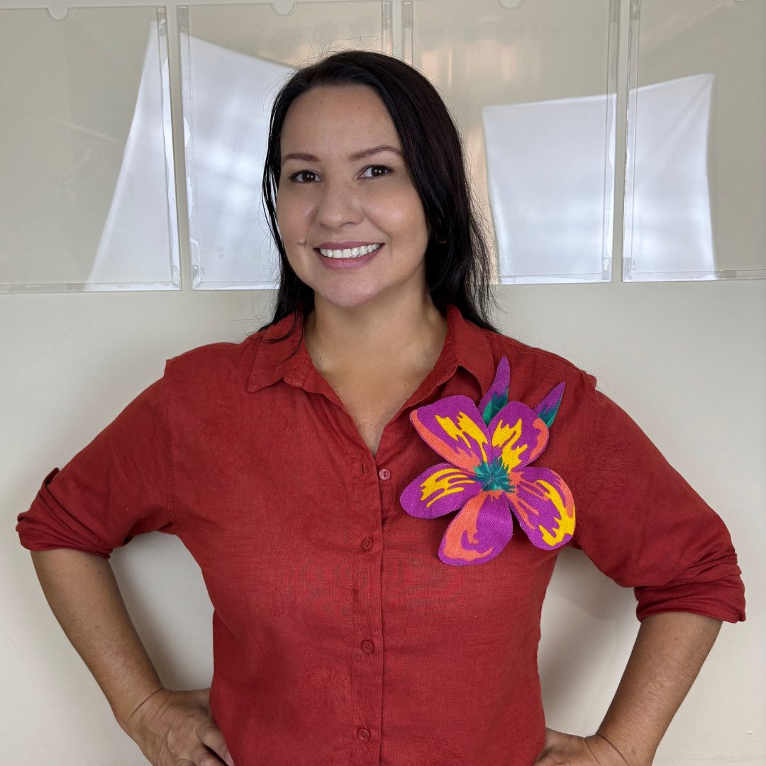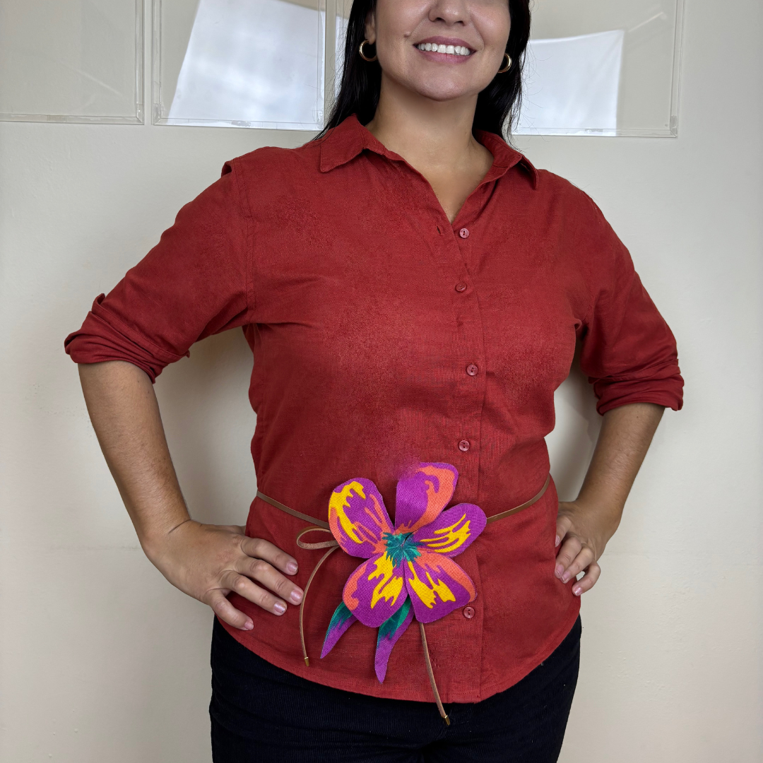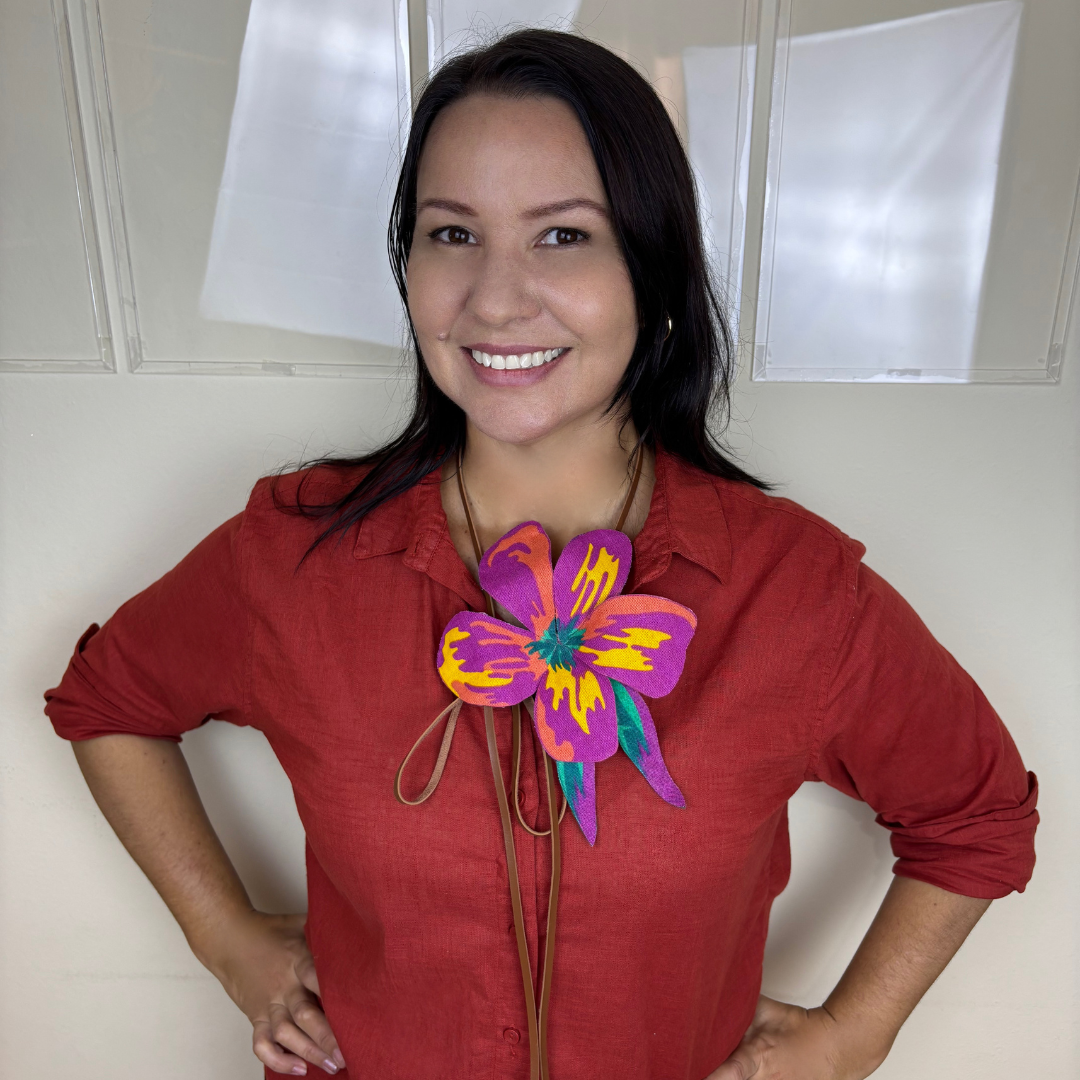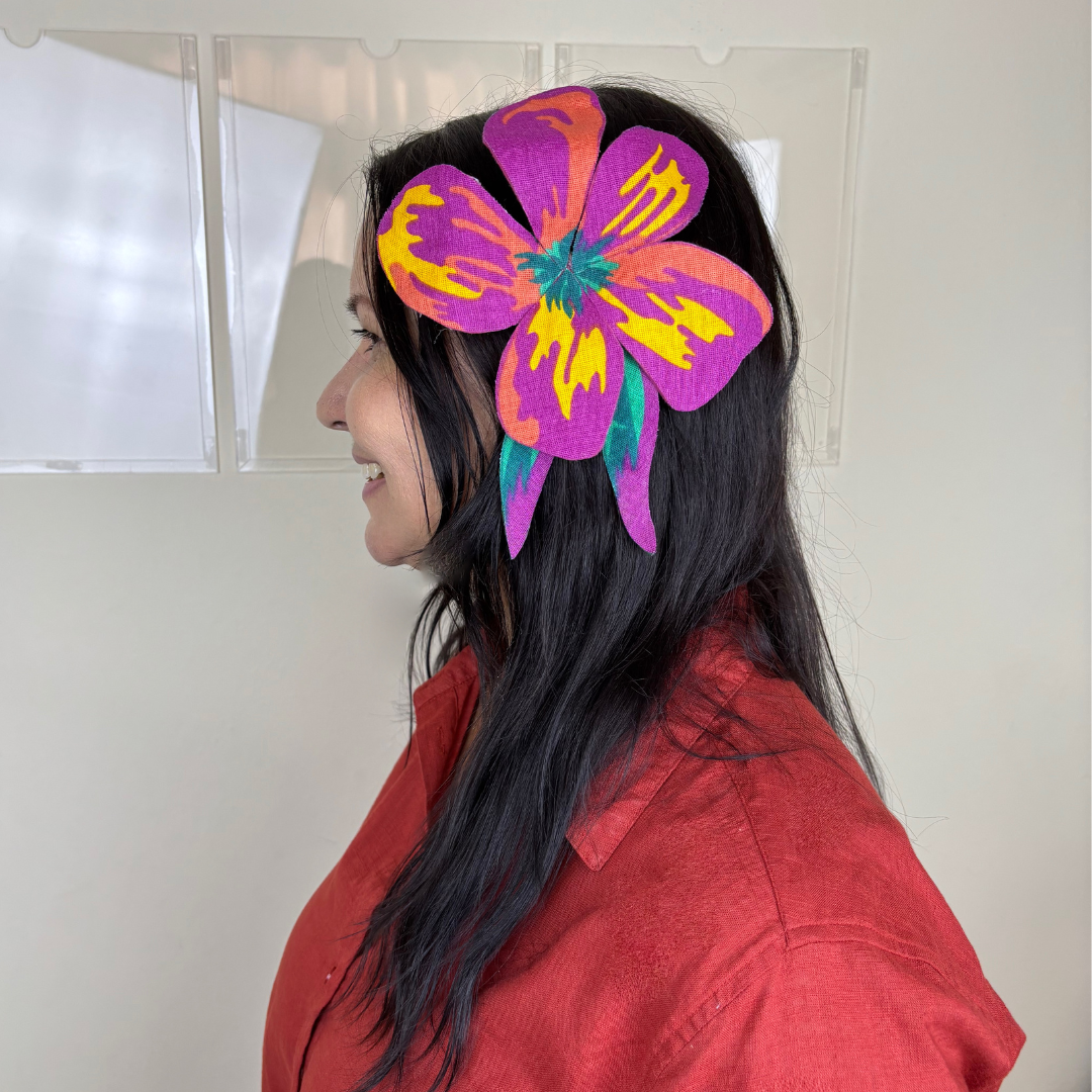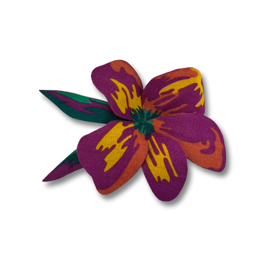 Flores artesanais em tecido chita com efeito 3D. Use de várias formas: em roupas, bolsas e até na decoração. Um toque vibrante e autêntico para composições criativas e tropicais.