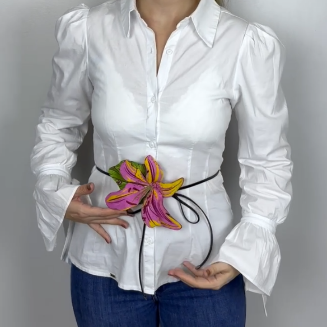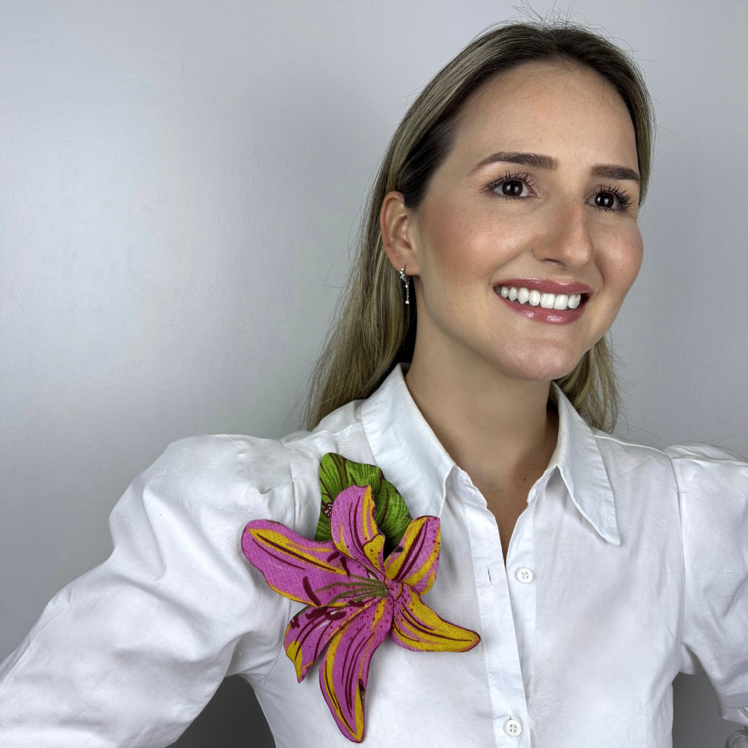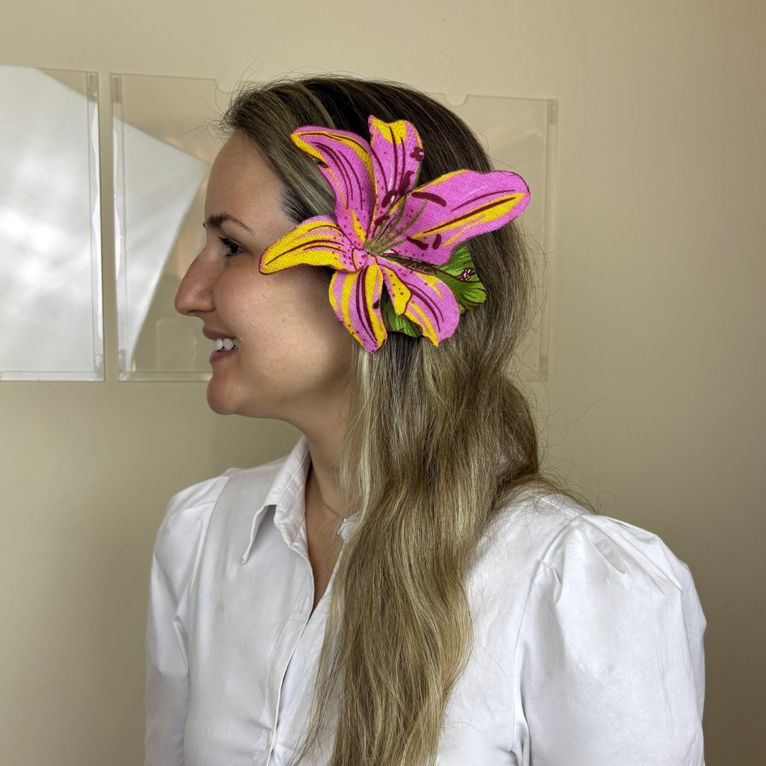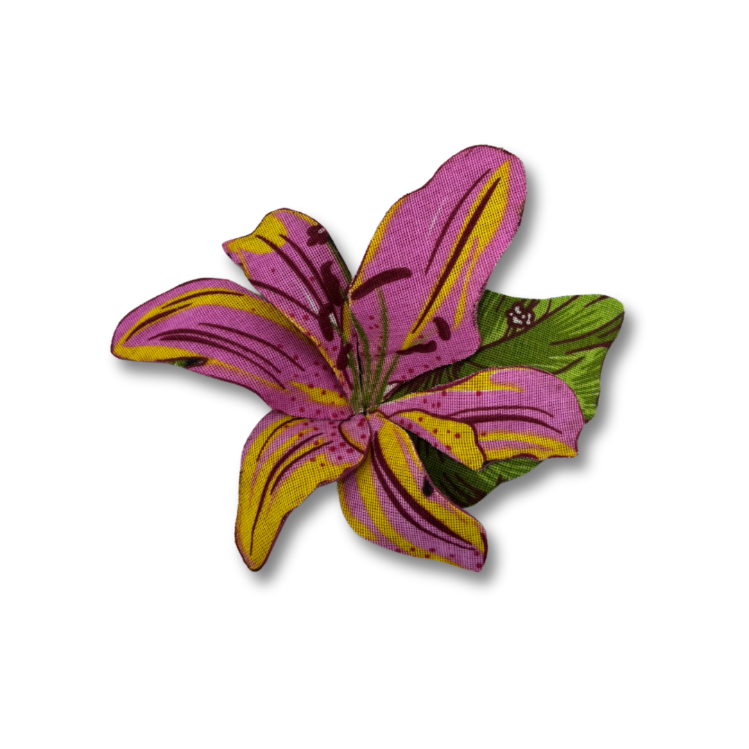 Flores artesanais em tecido chita com efeito 3D. Use de várias formas: em roupas, bolsas e até na decoração. Um toque vibrante e autêntico para composições criativas e tropicais.