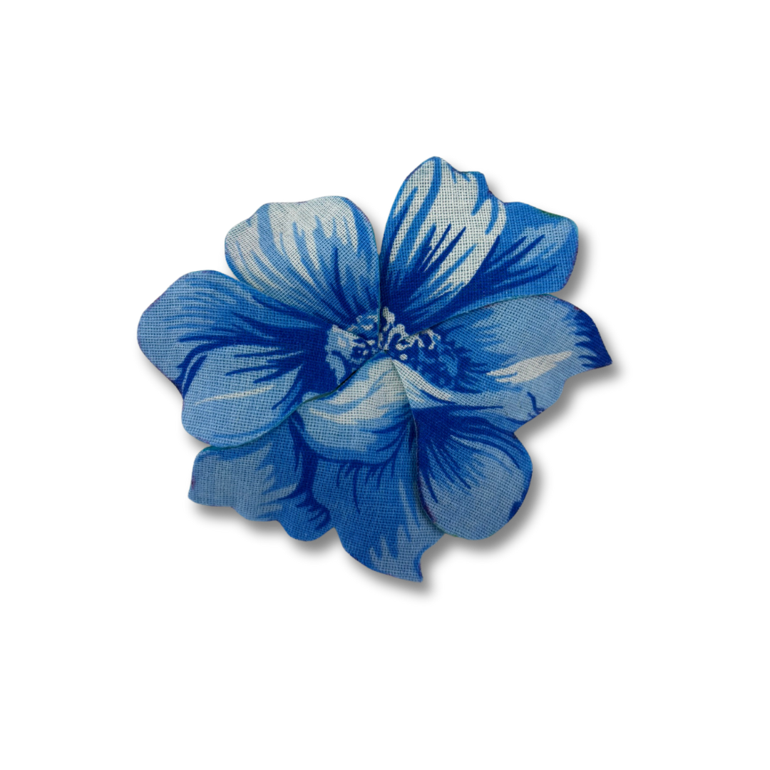 Flores artesanais em tecido chita com efeito 3D. Use de várias formas: em roupas, bolsas e até na decoração. Um toque vibrante e autêntico para composições criativas e tropicais.